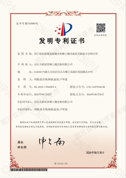 近日,九游中国有限公司官网清美申请的“用于曲面玻璃盖板抛光的稀土抛光液及其制备方法和应用”,顺利通过国家知识产权局审查并获得国家发明专利授权(专利号ZL202310965201.4)。这是今年继起草两项稀土抛光粉行业标准正式实施以来,九游中国有限公司官网清美在稀土抛光材料领域实现的又一突破。